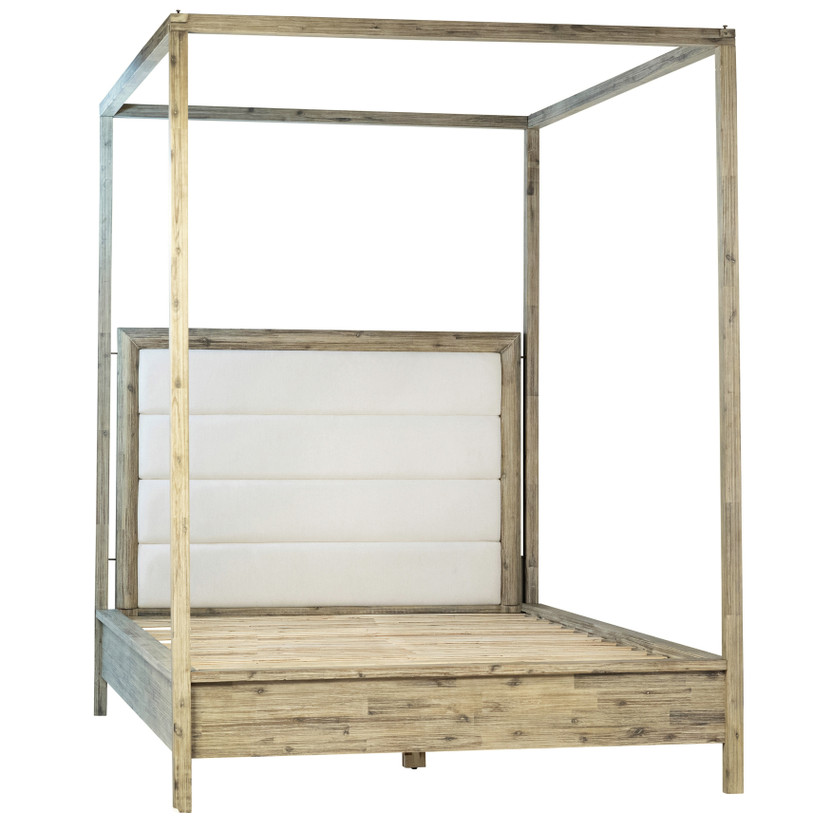 A clean-lined design lends modern style to this canopy bed. Showcasing the beautiful, natural grains and knots of the solid acacia wood. The light warm wash finish of the wood bed frame along with the white, cotton blend upholstered headboard will brighten up your bedroom for an open and airy look.